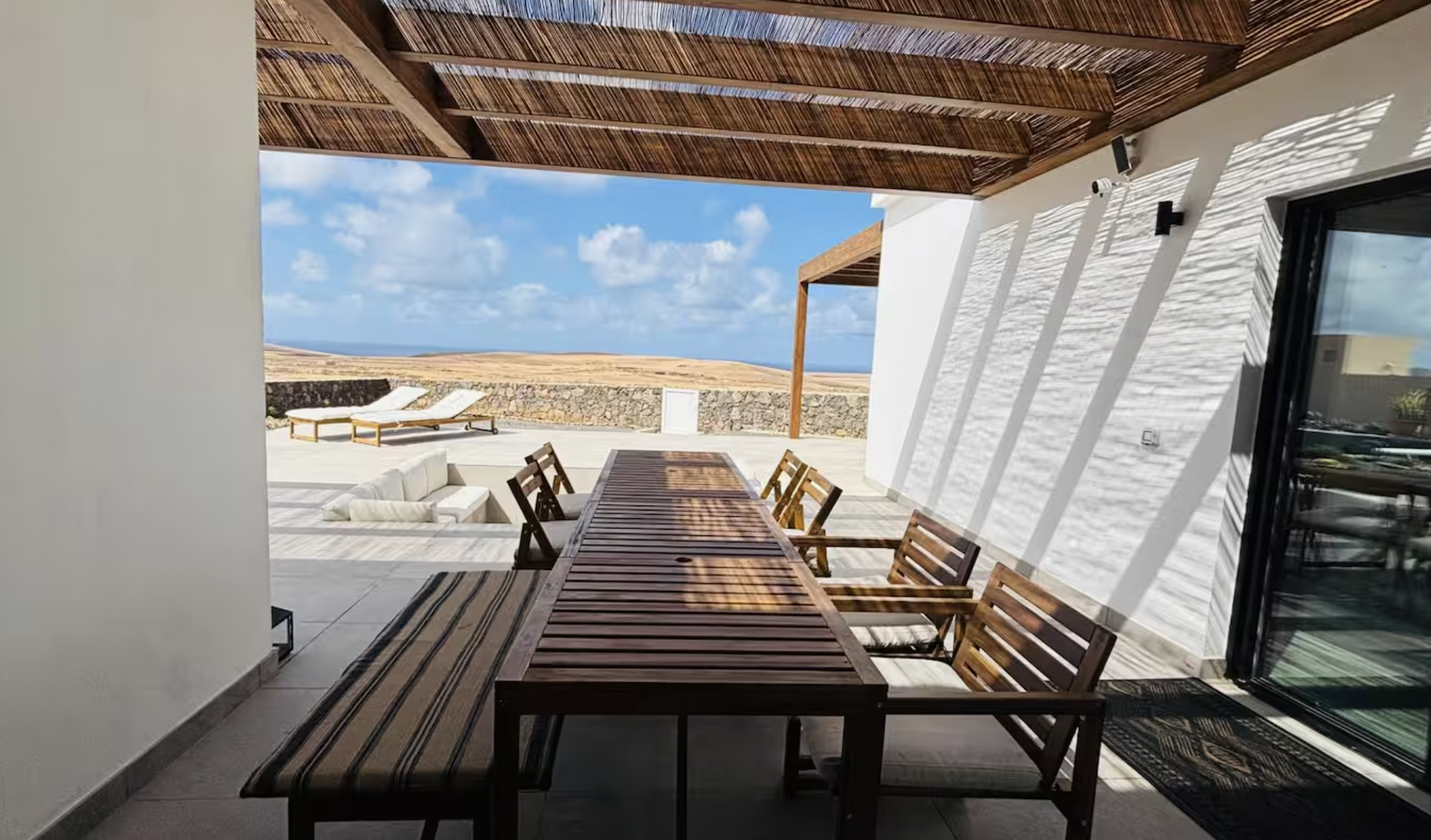 L’espace de vie, lumineux et ouvert, s’étend harmonieusement vers une terrasse et un jardin privés avec piscine chauffée. Après une journée d’exploration ou de pratique, laissez-vous envoûter par les couchers de soleil spectaculaires qui illuminent la montagne de Tindaya.